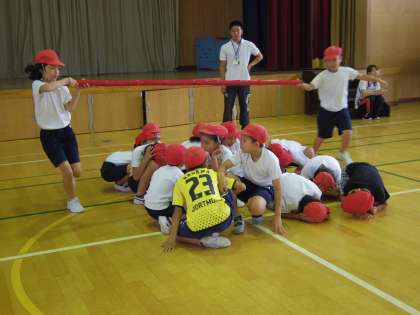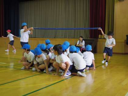 台風は京都市から少しずつ遠ざかっていきましたが,待鳳小学校の体育館の中で「ハリケーン」が発生した模様です。とても元気な子どもたちのハリケーンです。運動会の種目の「台風の目」の練習をしています。