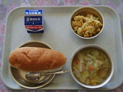 今日の給食です。毎週水曜日は「パンの日」です。パンの中にチーズが入っていてとてもおいしいです。