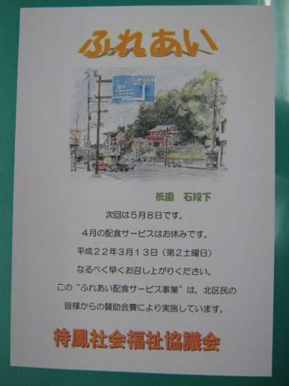 配食サービスも今年度最後となりました。ボランティアさんの手作りのあたたかいお弁当を,今日は6年生児童も一緒に配ってくれました。一年間お世話になりました。来年度もよろしくお願いします。新年度の配食サービスは,5月8日からです。