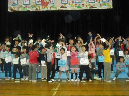 全校のお友だちと一緒にゲームをしました。ゲームは「○×ゲーム」です。みんな楽しそうです。