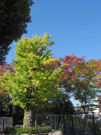 舟岡山には,赤や黄色に色づいた木々がたくさんあり,すっかり秋色に染まっていました。