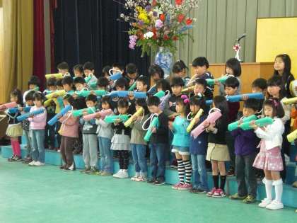 PTA会長さんからは「まわりの人たちには思いやりを持って接しましょう。」というお祝いの言葉をいただきました。その後,地域の諸団体の代表のみなさんから祝品をいただきました。ありがとうございました。引き続き,2年生がお迎えの言葉を披露してくれました。