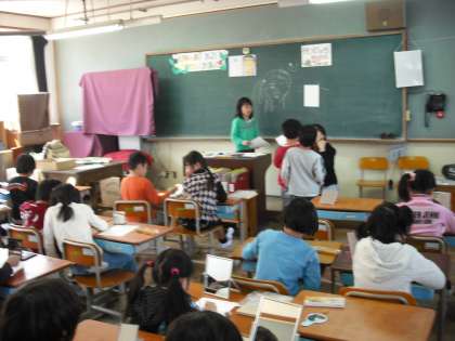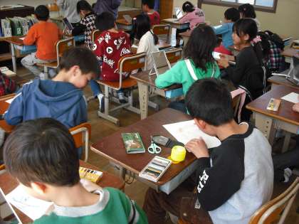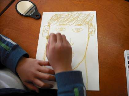 3年生も教室掲示する自分の顔を描いています。今日は下絵です。そっくりに描けているかな。下絵が出来上がったら絵の具を塗って仕上げます。