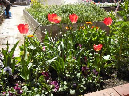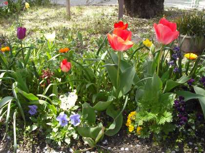 陽光のもと花壇やプランターはチューリップやパンジーの花でいっぱいです。これからいろんな花も咲きだします。とても楽しみです。