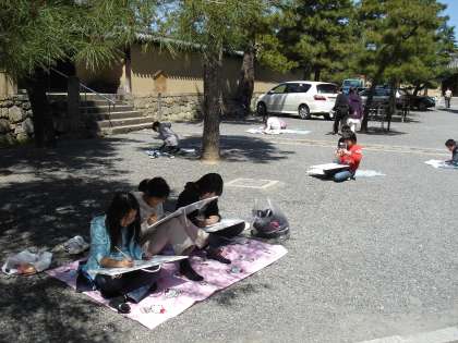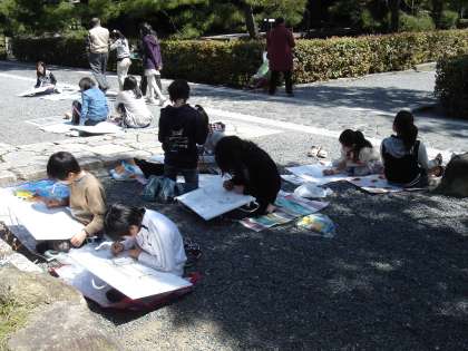 お寺の建物を描くのは大変難しいですが,今日は下絵を描きました。仕上げは学校で行います。