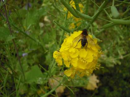 菜の花にミツバチが飛んできて蜜を吸っています。何気ない春の風景です。