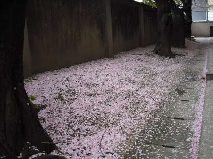 桜が散り始め,花びらのじゅうたんができています。特に体育館裏は誰も踏むことなく,きれいなじゅうたんが出来上がっています。