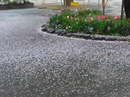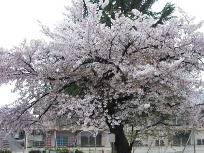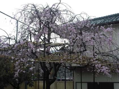 おはようございます。4月12日(月)の桜のようすです。雨降りのためソメイヨシノの花びらがけっこう散ってきています。枝垂れ桜は今が見ごろです。