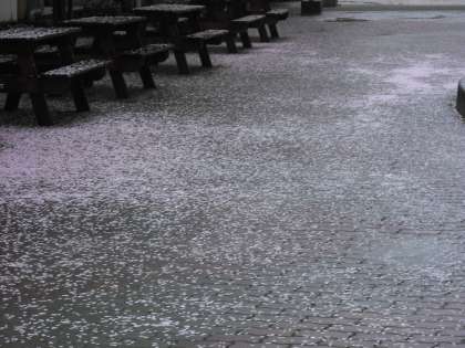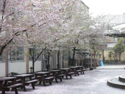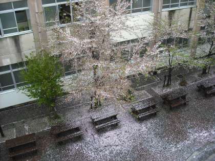 中庭のソメイヨシノはずいぶん散ってきています。葉桜のなってきています。