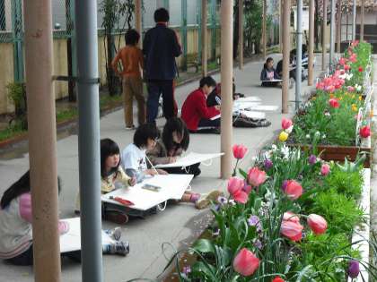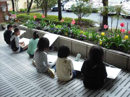 花壇にはチューリップやパンジーなど,春の花がいっぱい咲いています。5年生が教室も春いっぱいにしようと写生をしています。