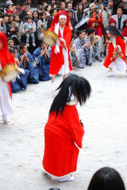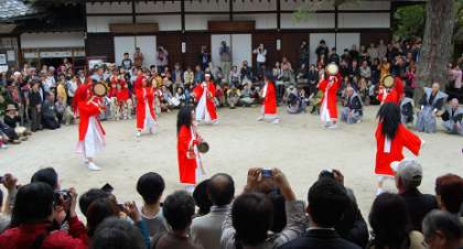 「やすらい祭」の続編です。花の精にあおられて陽気の中に飛散するという悪疫を,囃子や歌舞によって追い立てて,花を欺く風流傘に宿らせ,紫野疫社に送り込み神威を仰いで鎮めるというのがこの祭の行法です。