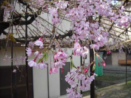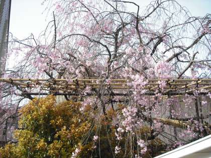 枝垂れ桜はまだまだ大丈夫です。旭にピンク色の花びらが輝いています。