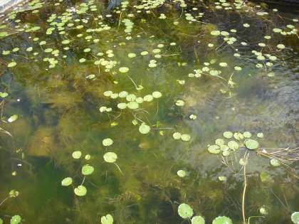 アサザの葉が水面に出てきはじめました。もう少しすると,観察池はアサザの葉でいっぱいになります。ヒシはまだ少し先になりそうです。