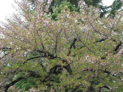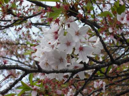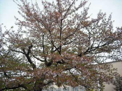 おはようございます。4月20日の桜の様子です。ソメイヨシノはところどころに花をつける程度になってしまいました。今日は天気予報では雨,楽しませてくてたソメイヨシノも終わりを迎えそそうです。