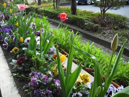 入学式に新1年生を迎えてくれた赤や黄色のチューリップが終わりを告げようとしていますが,他の色のチューリップはまだまだ元気です。なんと,これから花を咲かそうとしているチューリップもたくさんあります。