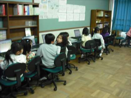校内にある野草の名前をコンピュータを使って調べています。図鑑を開けると写真と文で説明があり,わかりやすいね。コンピュータの扱い方にも早く慣れてね。