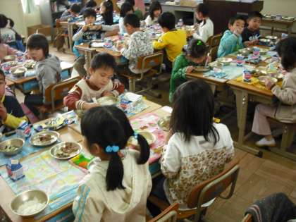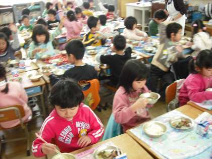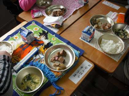 今日の給食のメニューはなま節と旬の食材の蕗(ふき)を使った煮つけです。かきたま汁もついています。残さずおいしくいただきましょう。