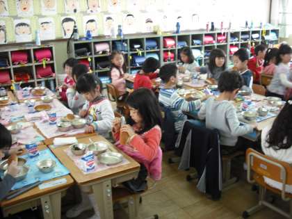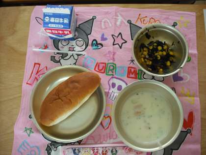 今日の給食のメニューは味つけコッペパン,手亡豆のクリームシチュー,ひじきのソティ,牛乳です。今日も残さずおいしくいただきましょう。