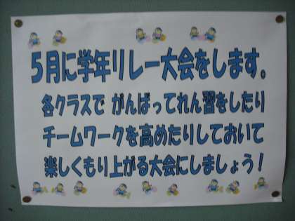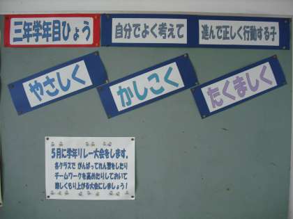 3年生では学年目標をもとに,各学級でめあてを決めて取組を進めています。また,個が生かされる学級・学年集団へと高めるために,5月には「学年リレー大会」を実施します。その日には,ぜひご参観ください。