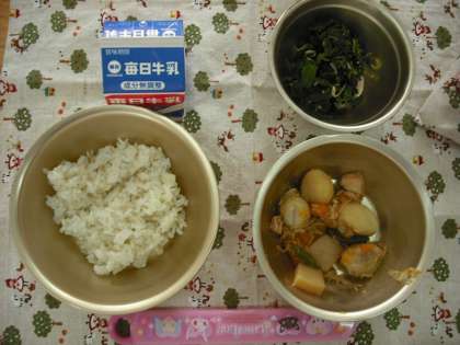 今日は麦ごはんと鶏肉と里いもの煮つけ,ほうれん草とじゃこのいためもの,牛乳です。しっかり食べて,残さないようにしましょう。