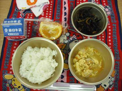 今日の給食は,ごはん・親子煮・ひじきの煮つけ・牛乳,そして,甘夏みかんがついています。上手に皮がむけるかな。残さず,おいしくいただきましょう。