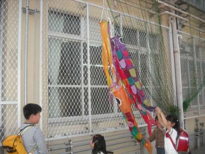 仲よし学級で鯉のぼりを作りました。いろいろな色のビニル袋を使って作りました。放課後,運動場に面した,南校舎の掲揚ポールに上げました。風に吹かれて気持ちよさそうに泳いでいます。5月いっぱい,上げておく予定です。学校に来られた時は,ぜひ見てください。
