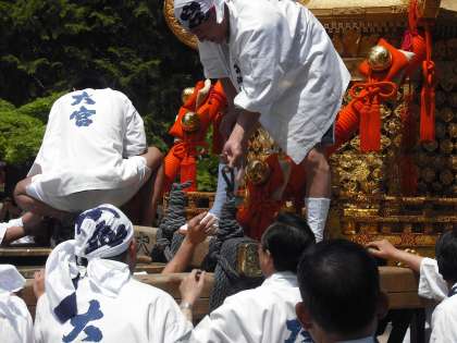 今日は神幸祭です。午後1時からの巡行に備えて,境内で御輿を組み立てています。