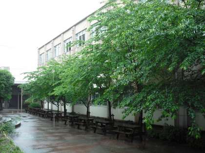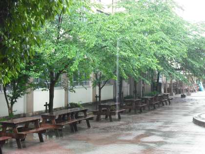 いつもは子どもたちでいっぱいの中庭。今日は雨でとても静かです。桜の新緑がとても鮮やかです。枝が伸びて,中庭の半分近くまで覆ってきています。これから暑くなると,いい日影ができますね。