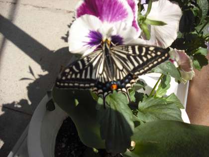 パンジーの花にアゲハチョウがきています。そろそろ,みかんの木に卵を産んでくれることでしょう。