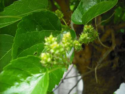 蚕の餌となる桑の木。桑の実ができてきました。成熟した果実はそのままでも甘酸っぱくておいしくて,果実酒やジャムにもなります。