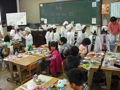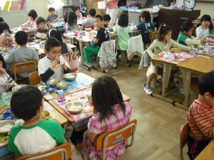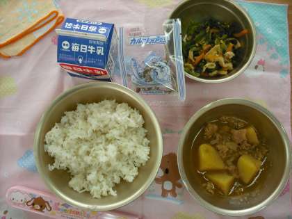 今日の給食メニューは,麦ごはん・肉じゃが(カレー味)・小松菜の煮びたし・牛乳・じゃこです。肉じゃがはカレー味だから人気のメニューの一つです。残さずおいしくいただきましょう。