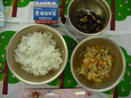 今日の給食メニューは,ごはん・他人煮・ひじき豆・牛乳です。おかわりする子もたくさんいます。残さずおいしくいただきましょう。