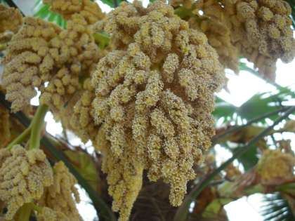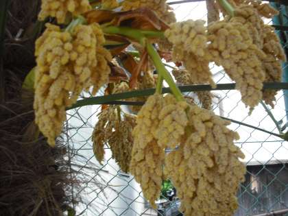 4月26日,5月6日掲載の「これはなあに?」の答えです。スポンジのようなものがずいぶん開いてきました。これは「シュロ(棕櫚)」の花です。みんなが見ている花とはちょっと感じが違いますね。運動場の東側と西側の植込みで見られます。ようく観察してみましょう。