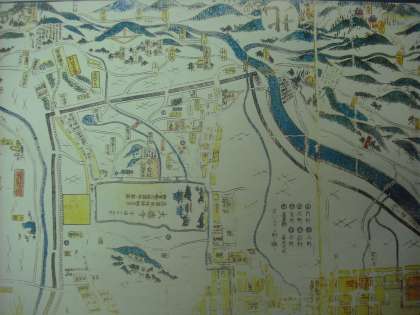 地図の周囲の黒い実線は「御土居」です。大徳寺には88の塔頭を有したそうですが,現在は24の塔頭です。大宮郷・大宮通の由来は,大宮社,大宮森(現在の久我神社)にちなんでついたものと思われるそうです。