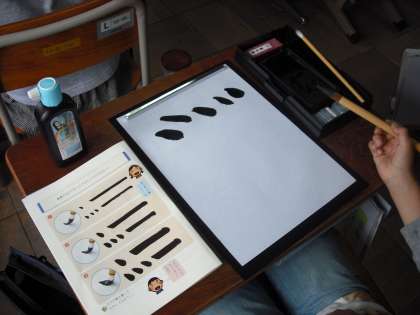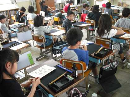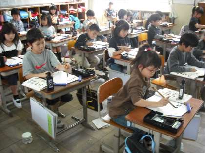 3年生になって書写の時間で毛筆が始まります。今日は道具がそろって初めての毛筆の時間です。用意の仕方や筆の持ち方を習って,まず,点をうちました。初めてで緊張している子がたくさんいました。