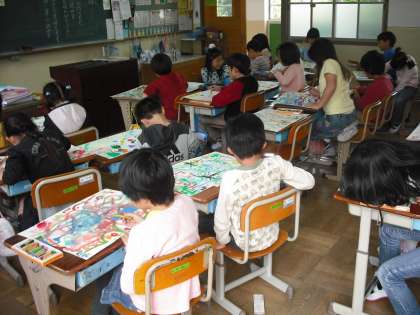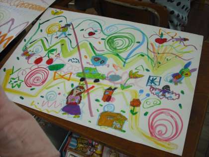 リズミカルな体の動きを楽しみながら,筆の動きを工夫して線を引きます。引いた線から思いついたことや何かに見立てたりしたことを絵にかいています。