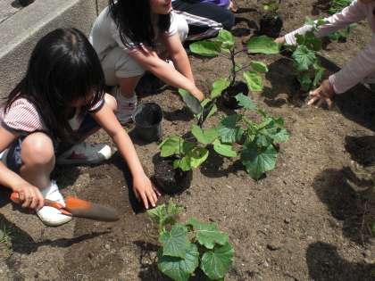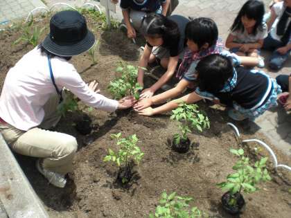 さあいよいよ実際に苗を植えます。苗を植える穴は,深すぎても浅すぎてもいけません。みんな慎重に取り組んでいます。大きく育つよう,たっぷり水をあげましょう。