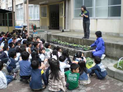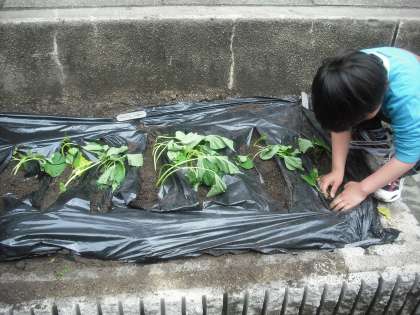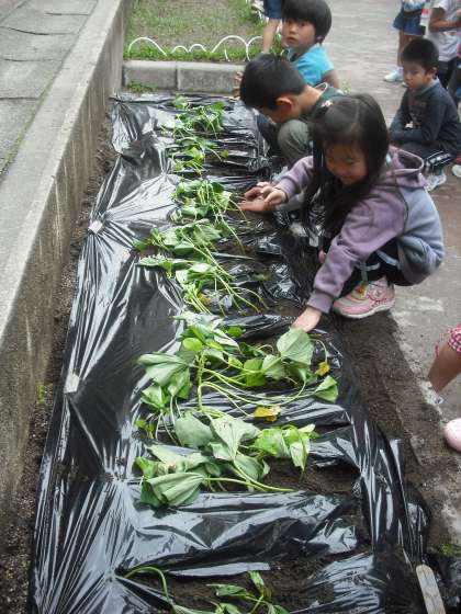 今日植えたサツマイモ,いつごろになったらできるのかな?楽しみだね。おいしいサツマイモ,たくさんできますように。