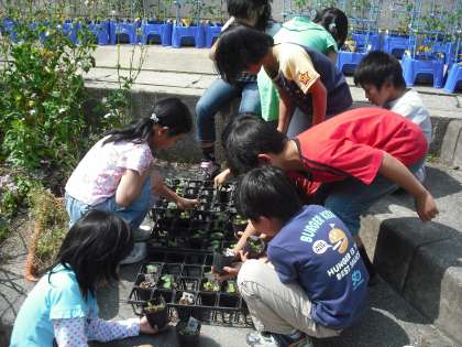 オクラとホウセンカの芽が出ています。これからどのように成長するか,しっかり観察しましょう。