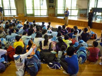 プレーホールで入所式をしました。到着した時の気温は20度ほどでした。さすがに、こちらは、京都市内よりも秋の深まりが早いようです。今日から、4日間、みんなで協力して楽しい山の家の活動を頑張っていきます。