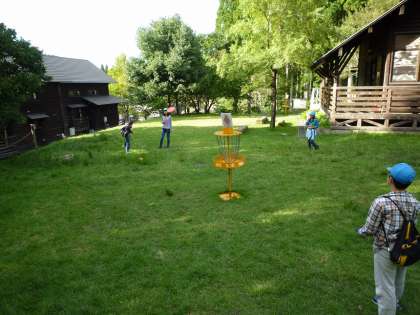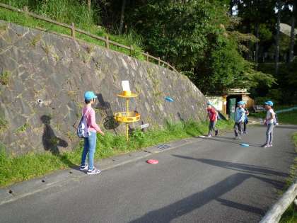 午後からの二つ目の活動は、フライングディスクゴルフです。所内に作られたコースを、グループごとに回って、スコアを競いました。思うようにディスクが飛ばず、苦労する子供たちもいれば、上手にゴールに入れることができた子供たちもいました。