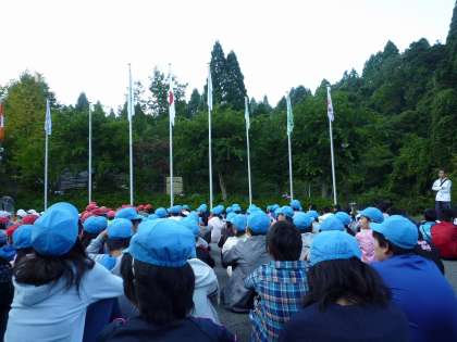 2日目の朝。今朝の気温は14度と、寒かったです。一緒に山の家で活動している5つの小学校が集まって、朝の集いを行いました。川岡小学校、上里小学校、鷹峯小学校、報徳小学校、そして、待鳳小学校、それぞれの学校紹介がありました。
