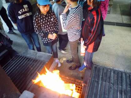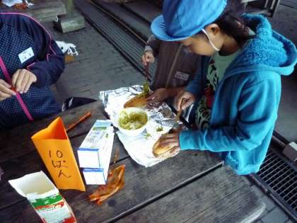 今朝の朝食は、パックドックです。パンに野菜とウインナーをアルミホイルに巻いて、牛乳パックに入れて温めます。みんな、自分のパンは、自分で準備しました。