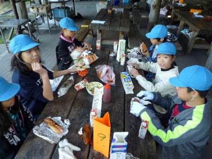 かまどで温めたパックドック。出来上がったグループから、いただきます。朝の冷たい空気と森林の香りを吸い、とてもおいしくいただきました。