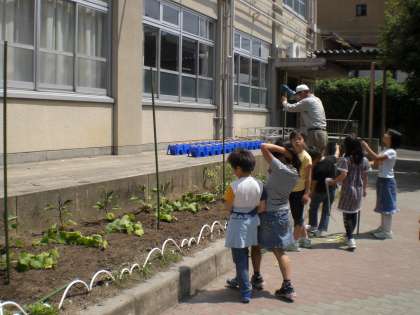 今日は,学校運営協議会の理事をしていただいてる,学区の土橋さんに来ていただいて,夏野菜を植えました。土橋さんには毎年お世話になっています。