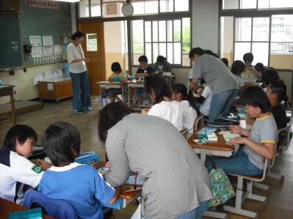 今日はゲストティチャ—として保護者の方がお手伝いにきてくれました。子どもたちはなかなかうまく出来ません。こつを教えてもらってなみ縫いに挑戦です。