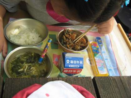 きょうは,お天気がよいので中庭で給食を食べました。