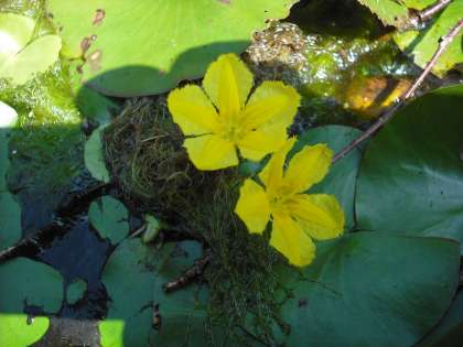 アサザの花が咲き始めました。北海道以外の各地の池や沼に生える多年生の水草です。スイレン(睡蓮)の葉を小型にしたような葉が水面に広がっています。池の中にあると遠いのでよく見えないこともありますが,近くで見ると実に繊細な花です。