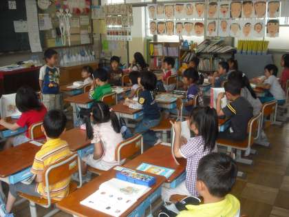 濁音のある言葉を読んだり書いたりできるようにするために,「かき」と「かぎ」のような言葉を集めています。楽しく学習する中で身についてきます。発表も友だちの方を向いてしっかり言えます。話し方のルールも身についてきました。