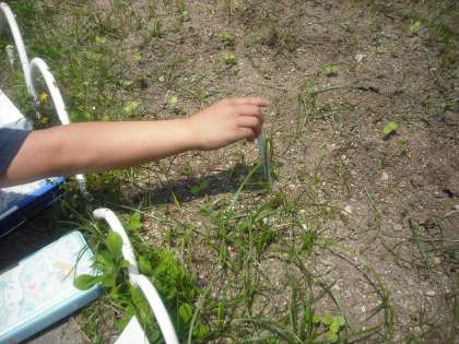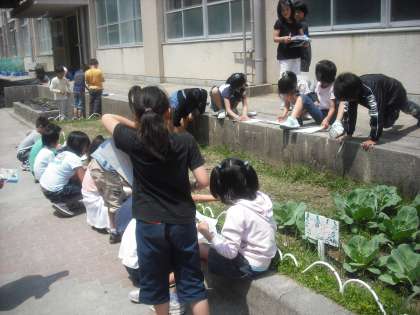 やっと発芽したオクラとホウセンカをさっそく観察しました。双葉の形や大きさを調べ,観察ノートに記録しました。